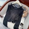 Backless design round neck grid hollow thin long-sleeved knitted sweater women's spring and summer simple and thin sunscreen top