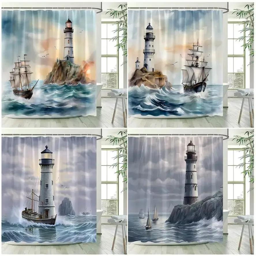 Sea Waves Nautical Shower Curtains Island Lighthouse Sailboat Ocean Landscape Bath Curtain Polyester Bathroom Decor with Hooks