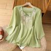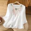 Elegant Bomull Lös Sommarskjorta Ärm Rund Hals Broderade Toppar för Kvinnor Vintage Blusar