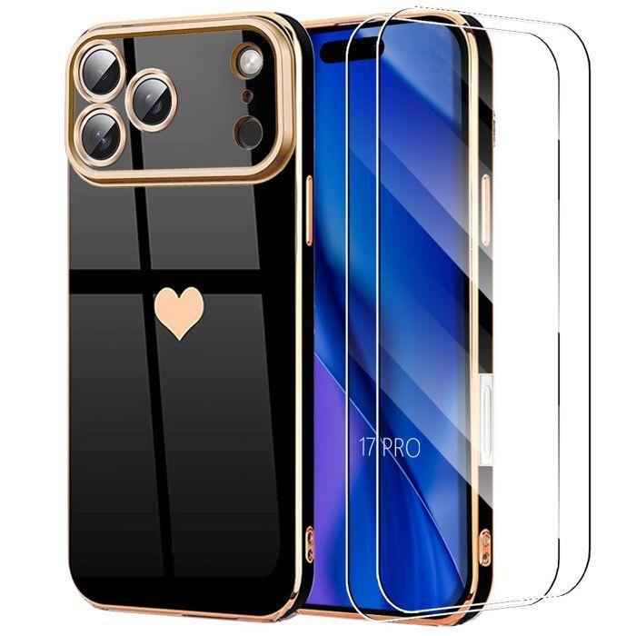 Skyddsskal - E.F.Connection - för iPhone 17 Pro - Stötsäkert Svart Hjärtmönster - 2 Härdat Glas
