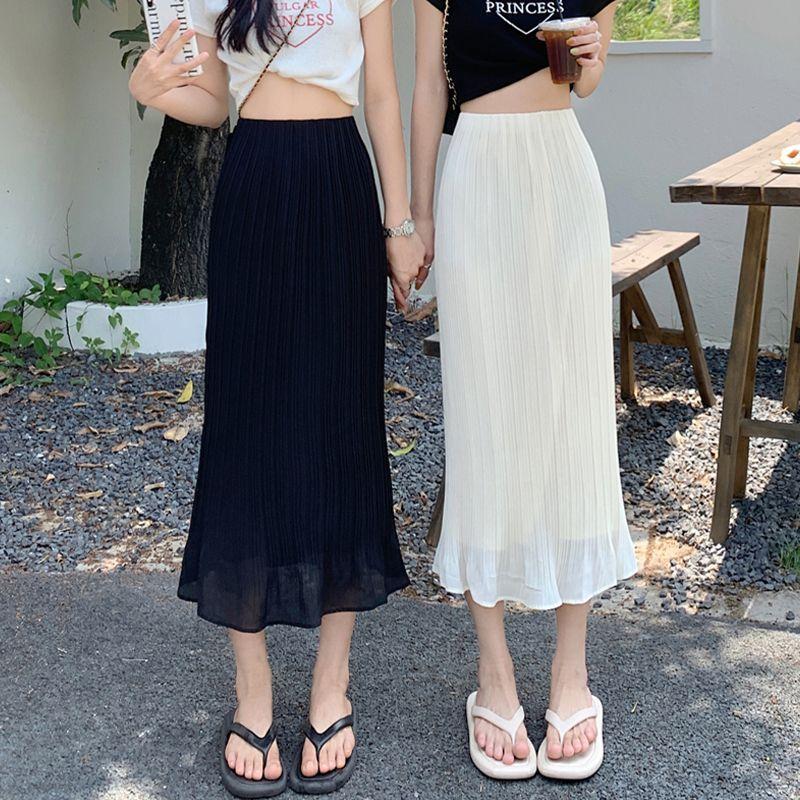 Women's Elegant Bag Hip Skirts High Waist Elastic Folds All-Match Commute Monochromatic Midi Skirts Summer Fashion
