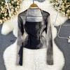 Long Sleeve Square-Neck Tie Dye Mesh Sunscreen Slim Fit Fake Two-Piece