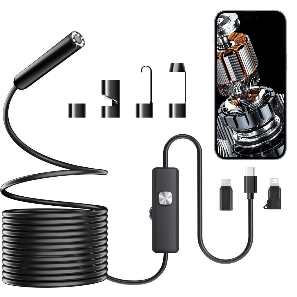 "Attachment" Endoscope camera x 1, 5m semi-rigid cable x 1, accessories: magnet x 1, hook x 1, protective cap x 1, side mirror x 1, manual x 1, Android adapter x 1, iPhone adapter x 1. It comes with three types of adapters that can be attached to the end of the endoscope camera, allowing you to retrieve small items that are hard to reach using the magnet or hook.