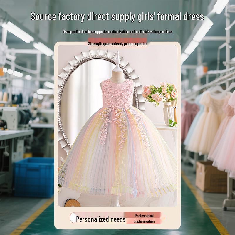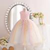 Denna förtrollande ärmlösa klänning är perfekt för varje ung flicka som vill fira sin födelsedag med stil.. Tillverkad av mjukt polyestermaterial, den har en bländande regnbågsnätöverdel som glittrar vackert i ljuset.. Denna klänning är utsmyckad med delikata pärlor och utstrålar elegans och charm, vilket gör den idealisk för att skapa magiska minnen på hennes speciella dag.