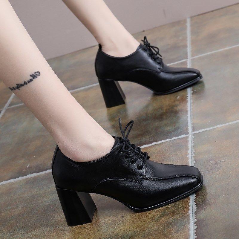 Small leather shoes style spring new square head thick heel high heels fashion lace-up versatile deep mouth single shoes