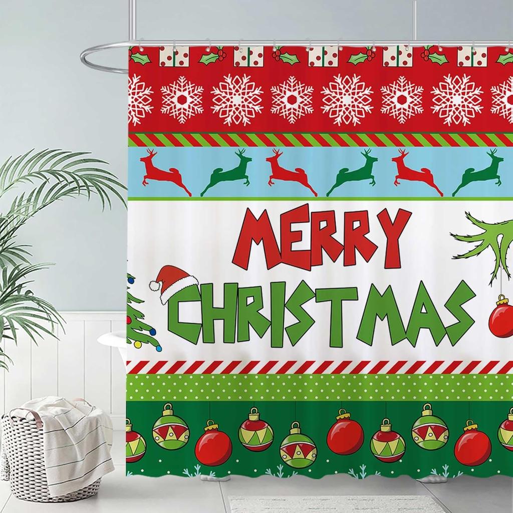 Christmas Shower Curtain Set - Holiday Bell/Christmas Tree/Snowflake Design, Waterproof Fabric, Winter Bathroom Decoration