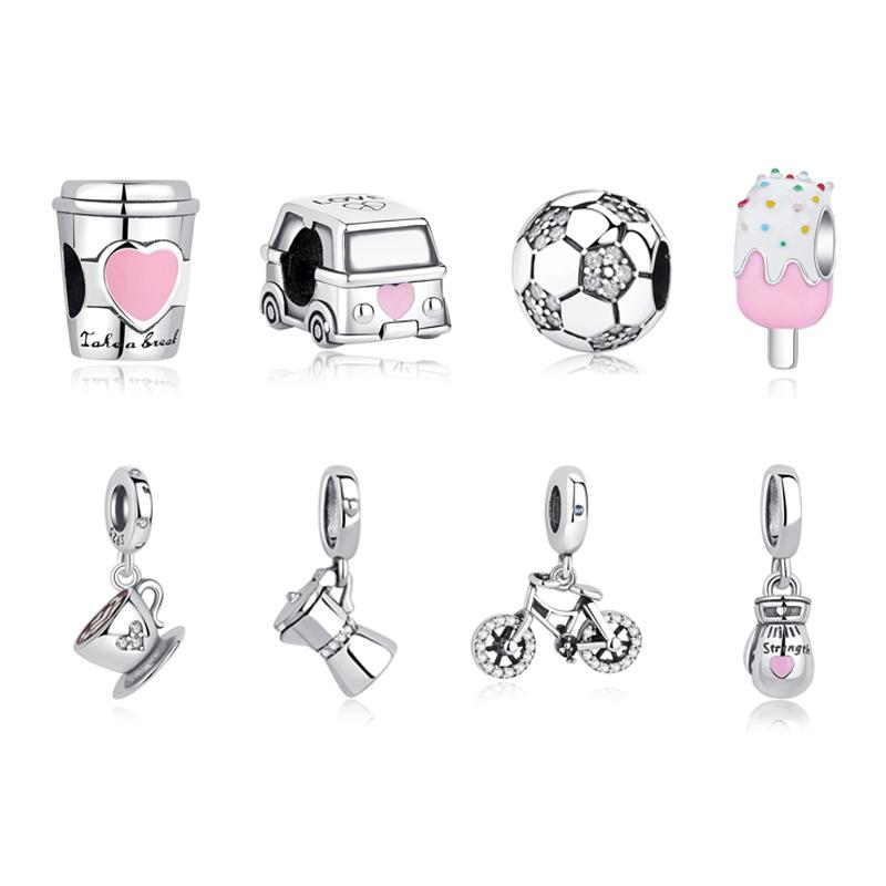 Original 925 Sterling koppar Berlocker Fotboll Fotboll Kärlek Kaffe Pärlor Passar Märkesarmband Halsband DIY Zirkon För Kvinnor