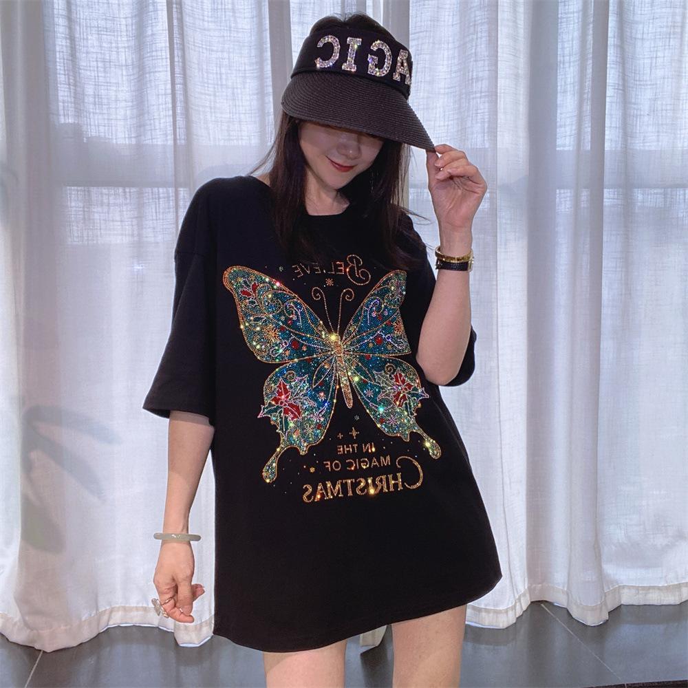 Plus Size Colorful Cartoon Bufferfly Diamonds Short Sleeve Tees for Women Clothing Summer Casual Loose O Neck T Shirt Knitwear
