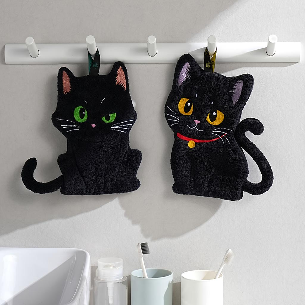 Black Cat Embroidered Hand Towel, Coral Fleece Super Absorbent Quick-Dry Hanging Bathroom and Kitchen Finger Towel