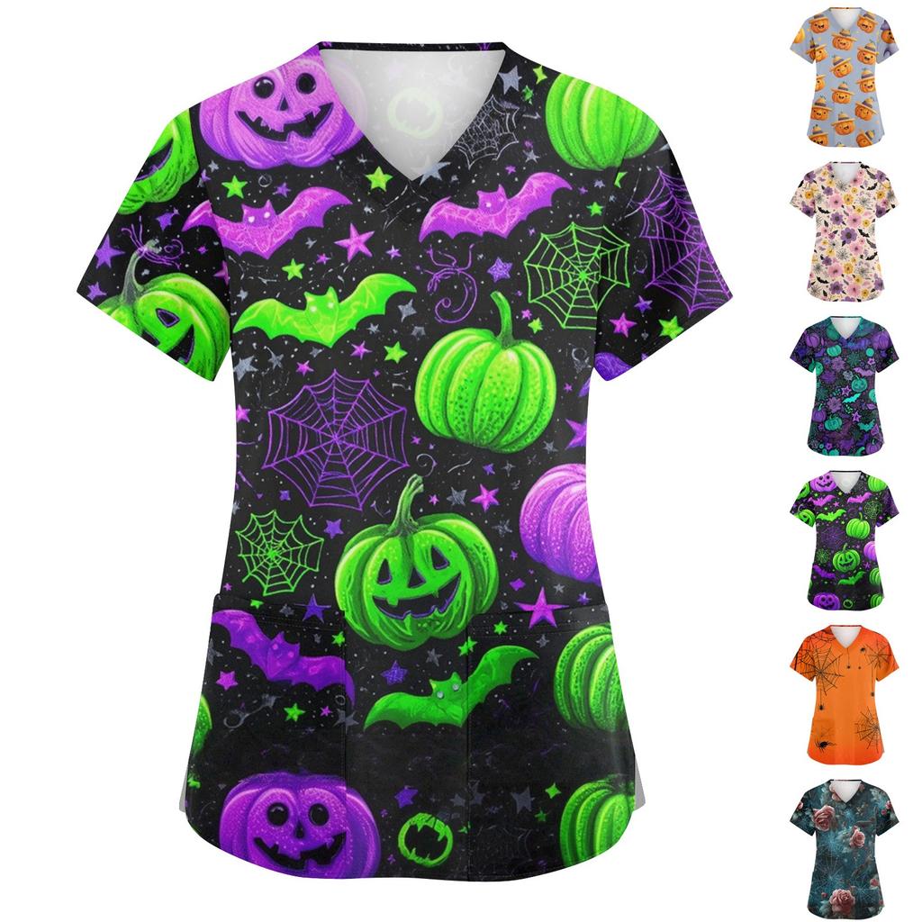 Dammode V-ringad Kortärmad Overall Med Fickor Tryckta Toppar Kläder