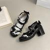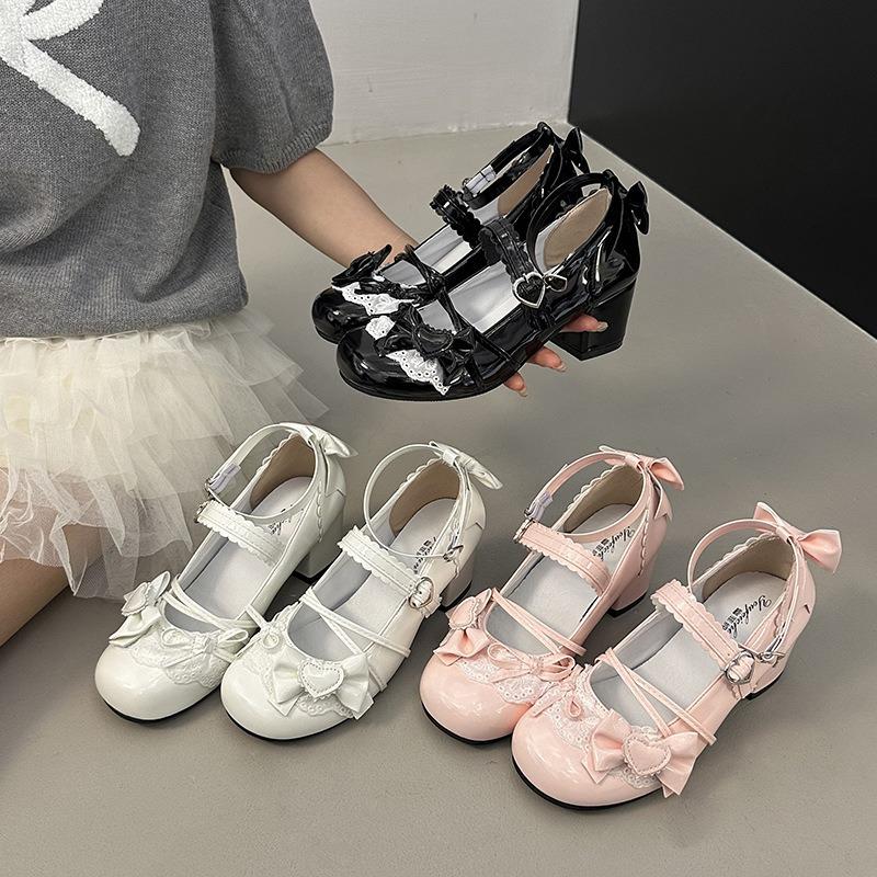 Små läderskor rosett söta Mary Jane-skor nya loli kvinnor söt spetskant tjock klack spänne läderskor