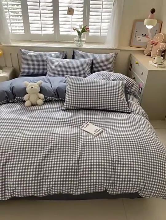 Sängkläder i ren bomull, Fyrdelars set, Enkelt rutigt, Bomullslakan, Påslakan, Randiga sängkläder
