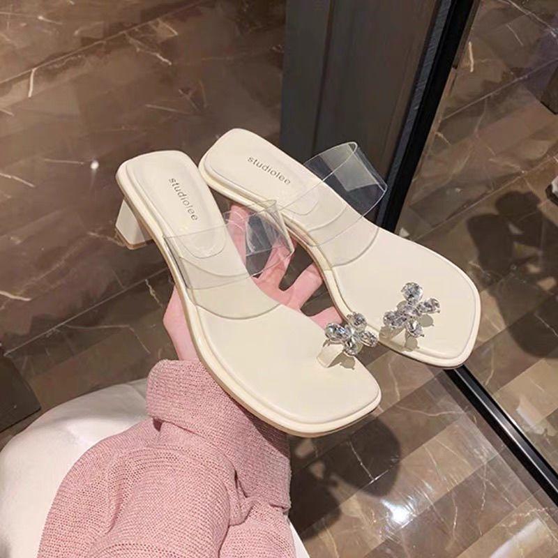 Franska älvvind rosett strass tjock klack tofflor 2025 nya sommar hög klack täckt tå transparenta sandaler dam