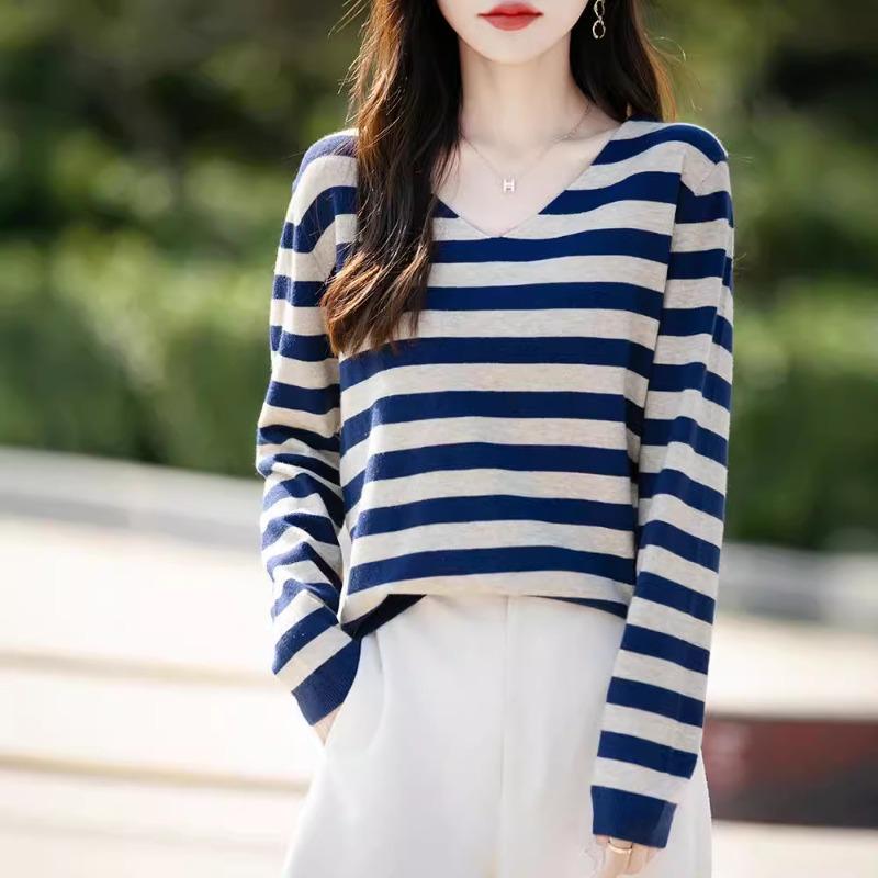 Spring and Autumn new V-neck striped women's long-sleeved knitted sweater loose and thin contrasting pullover versatile bottoming shirt