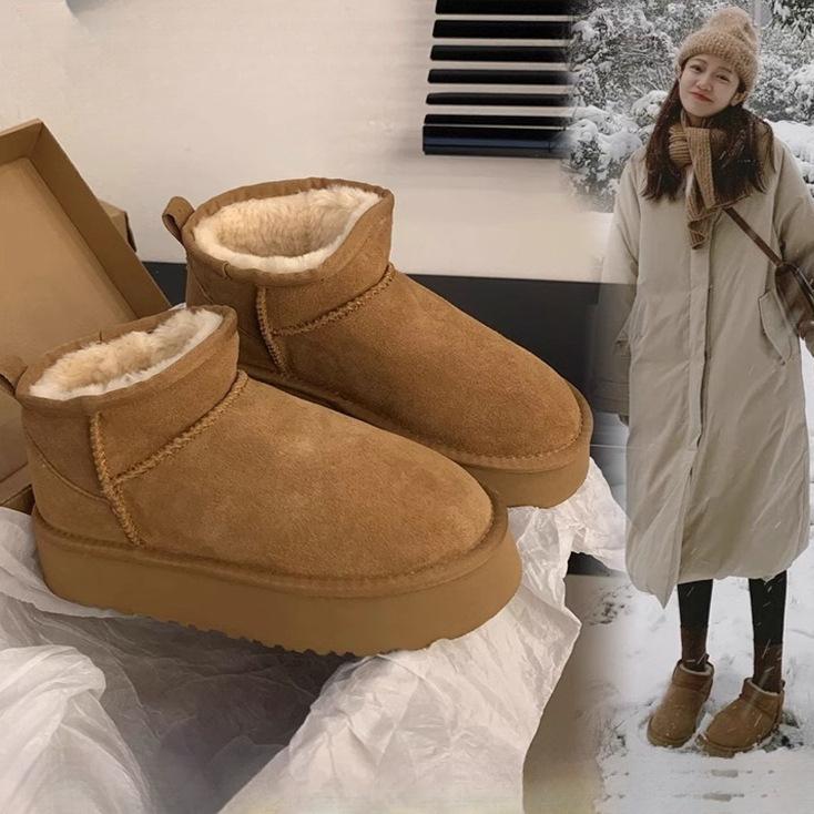 Snökängor med tjock sula dam pälsintegrerade 2025 nya Zhou Dongyu samma korta skaft vinter sammet förtjockade bomullsskor
