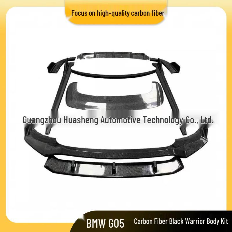 BMW X5 G05 Carbon Fiber Black Warrior Kit: Head Shovel, Front Lip, Side Skirts, Rear Wing, and Corner Spats.