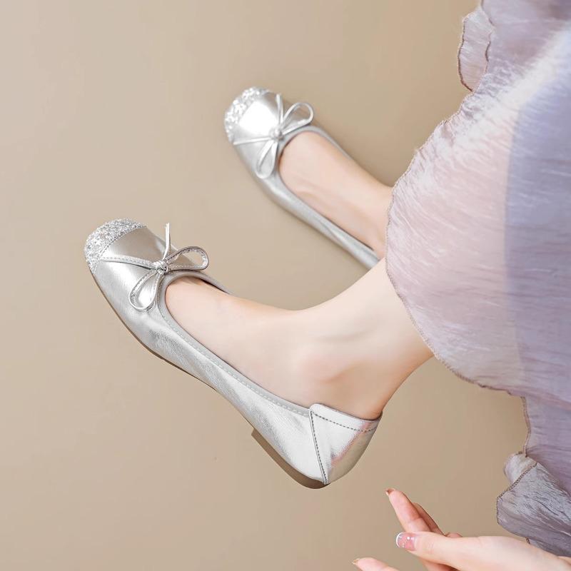 Mode enkelsskor dam höst nya platta mångsidiga rosett mjuk sula lätt mun silver Mary Jane skor dam
