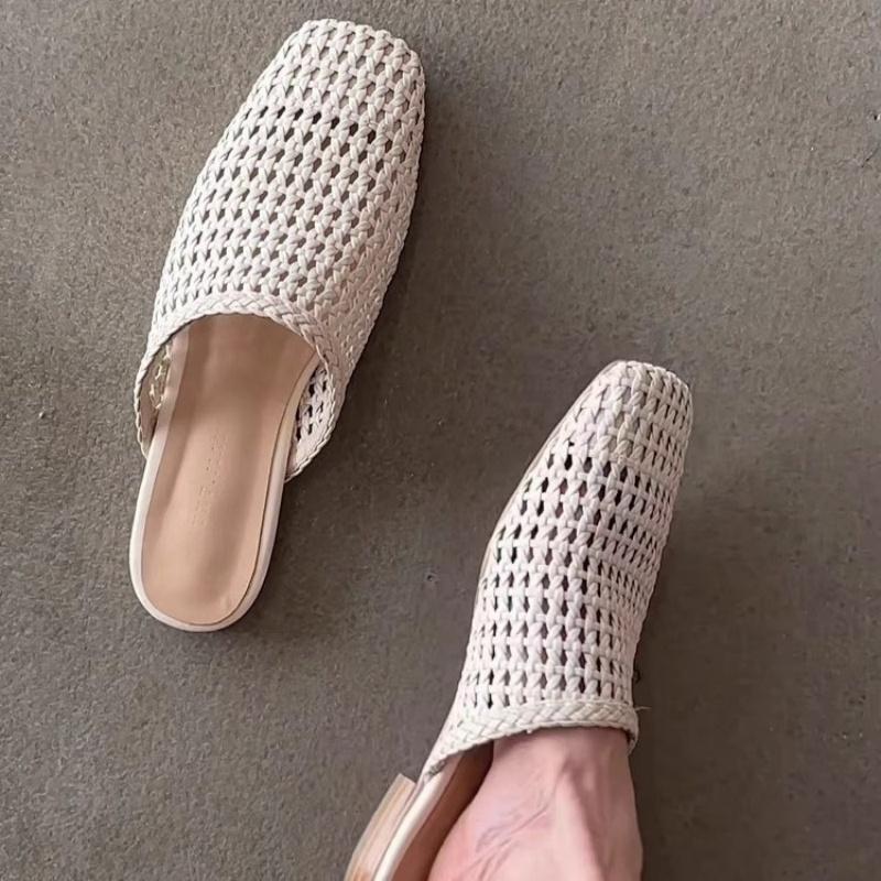 Fashion Hand made Woven Ladies Flat Sandals Versatile Hollow Outside Square Toe Slippers Designer New Comfy Simple Women Sandals
