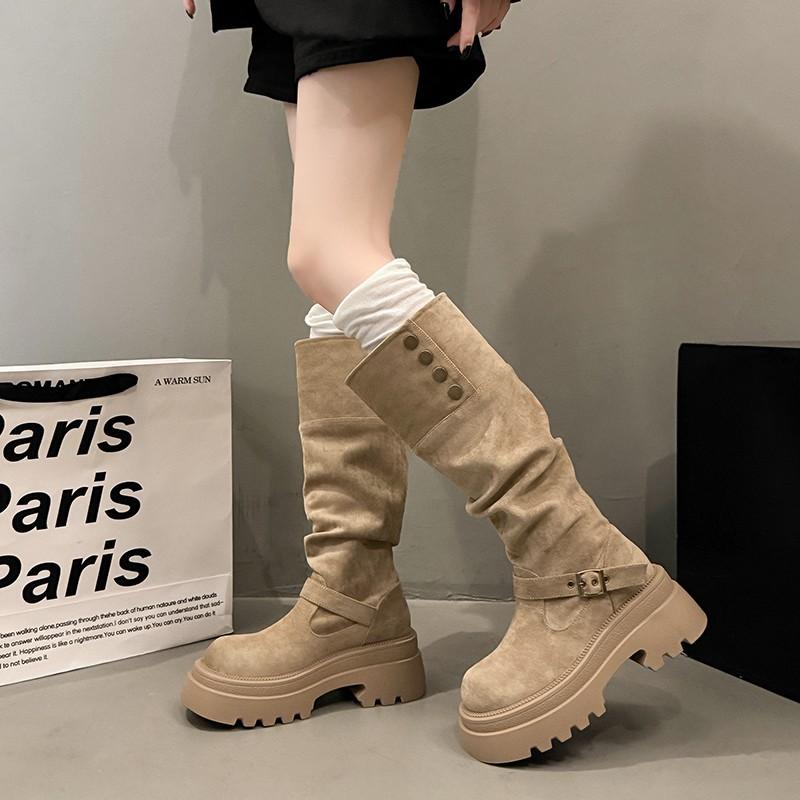 Två knähöga stövlar för barn 2025 ny höst retro mångsidiga, tunna och höjande tjockbottnade västerländska riddarstövlar för kvinnor