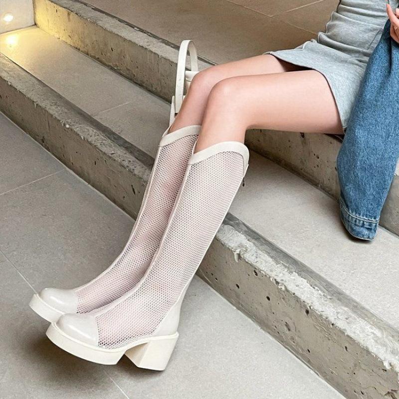 Nätstövlar sommar 2025 nya mångsidiga stövlar med rund tå fé-vind tunna ihåliga andningsbara svala stövlar höga