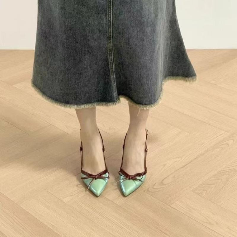 Mode 2025 Sommar Blandade Färger Damslingbacks Höga Klackar Spetsig Tå Tunn Klack Spänne Rem Pumps för Rosett Plus Size Sexig Fest