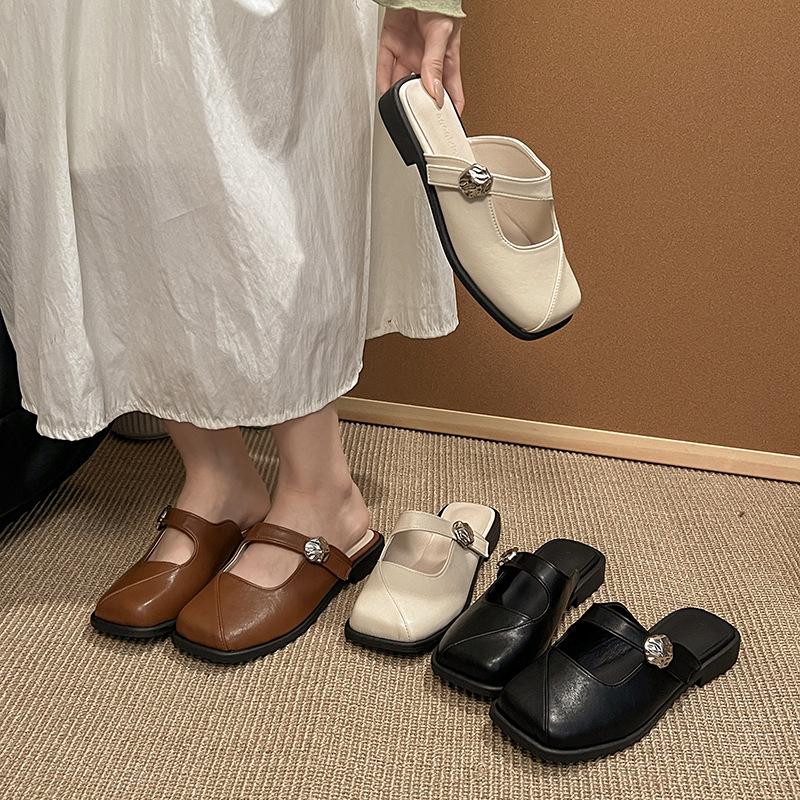 Korean version of the outer wear flat bottom versatile square head cool slippers women's 2025 new spring and summer low heel retro lazy bag head ha