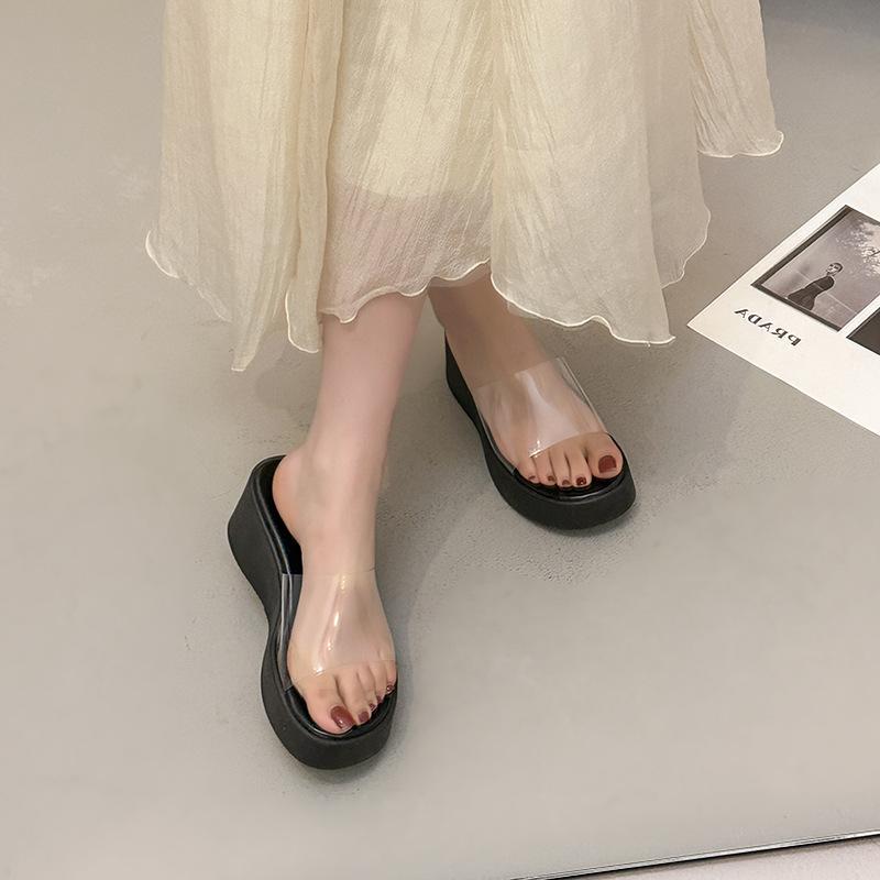 Muffin tjocksulade coola tofflor fé-skor 2025 ny sommar mode ytterkläder kilklack höjande transparent bälte sandaler