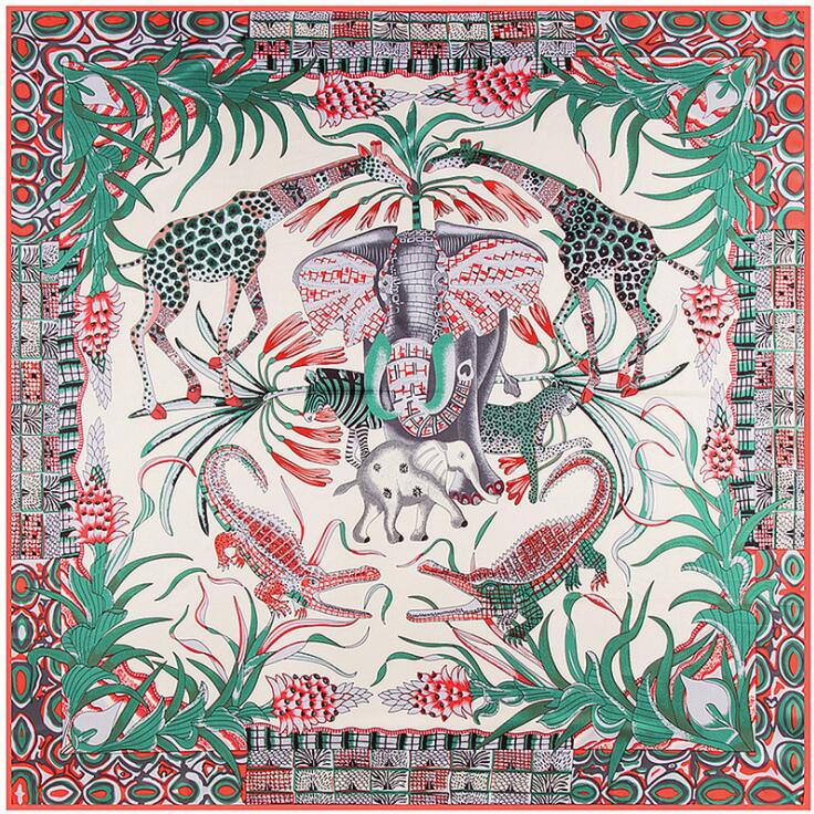 130cm Twill Silk Scarf Women Luxury Brand Giraffe Elephant Design Square Scarves Large Bandana Kerchief Hijab Female Head Scarf