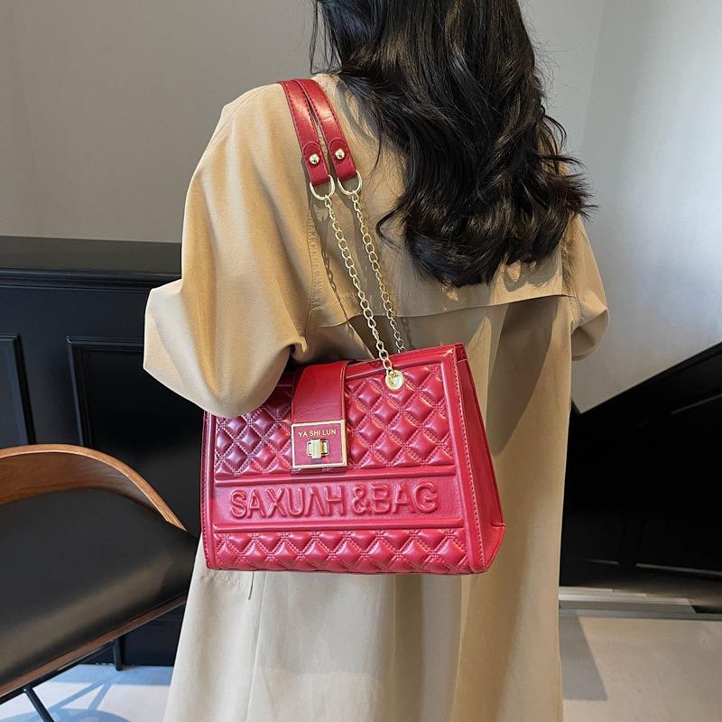 Rombformad kedjeväska dam stor kapacitet ny höst och vinter röd axel bröllopsväska pendlarväska