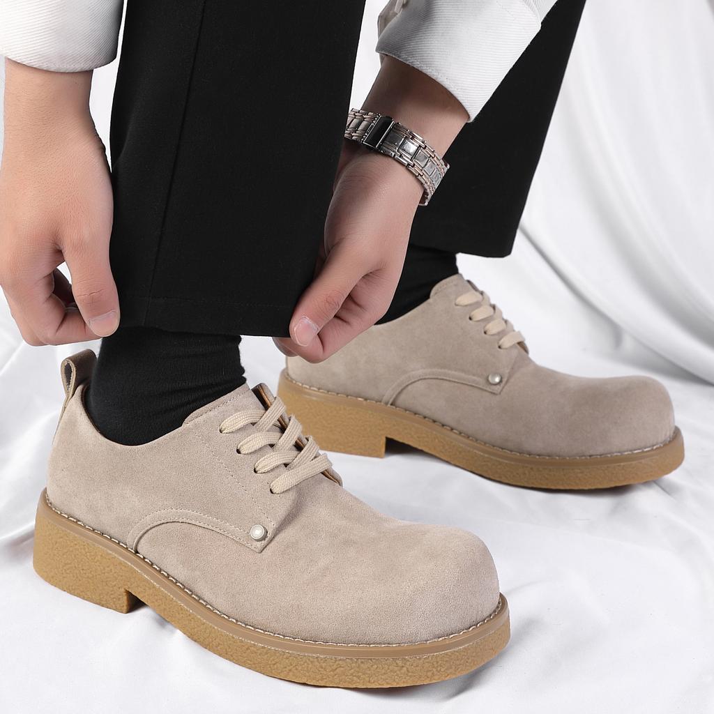 Fur derby shoes men's 2025 spring and summer breathable low-top rhubarb boots thick sole heightening fashionable casual tooling leather shoes