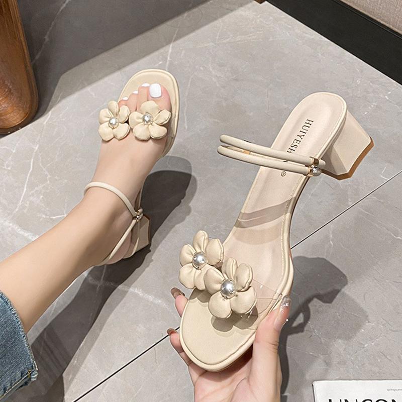 Mode blomma dekoration transparenta sandaler kvinnor smal rem ankelrem gladiator sandaler kvinna medelhöga klackar tofflor stor storlek 43
