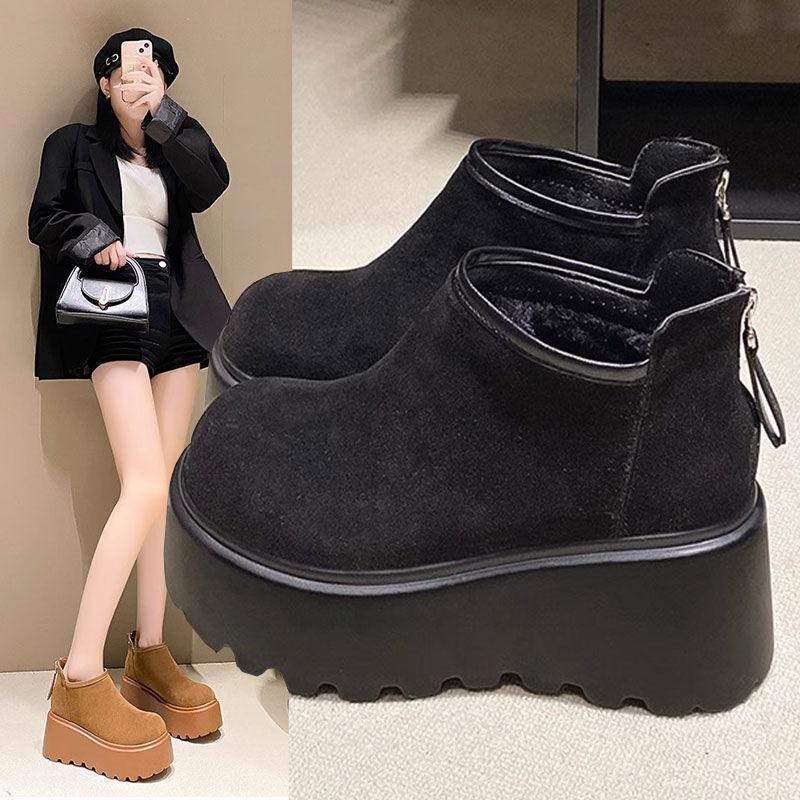 Retro mocka snökängor med tjock sula för kvinnor vintern 2025, nya små höjdökande sammetsvarma bröd bomullsskor