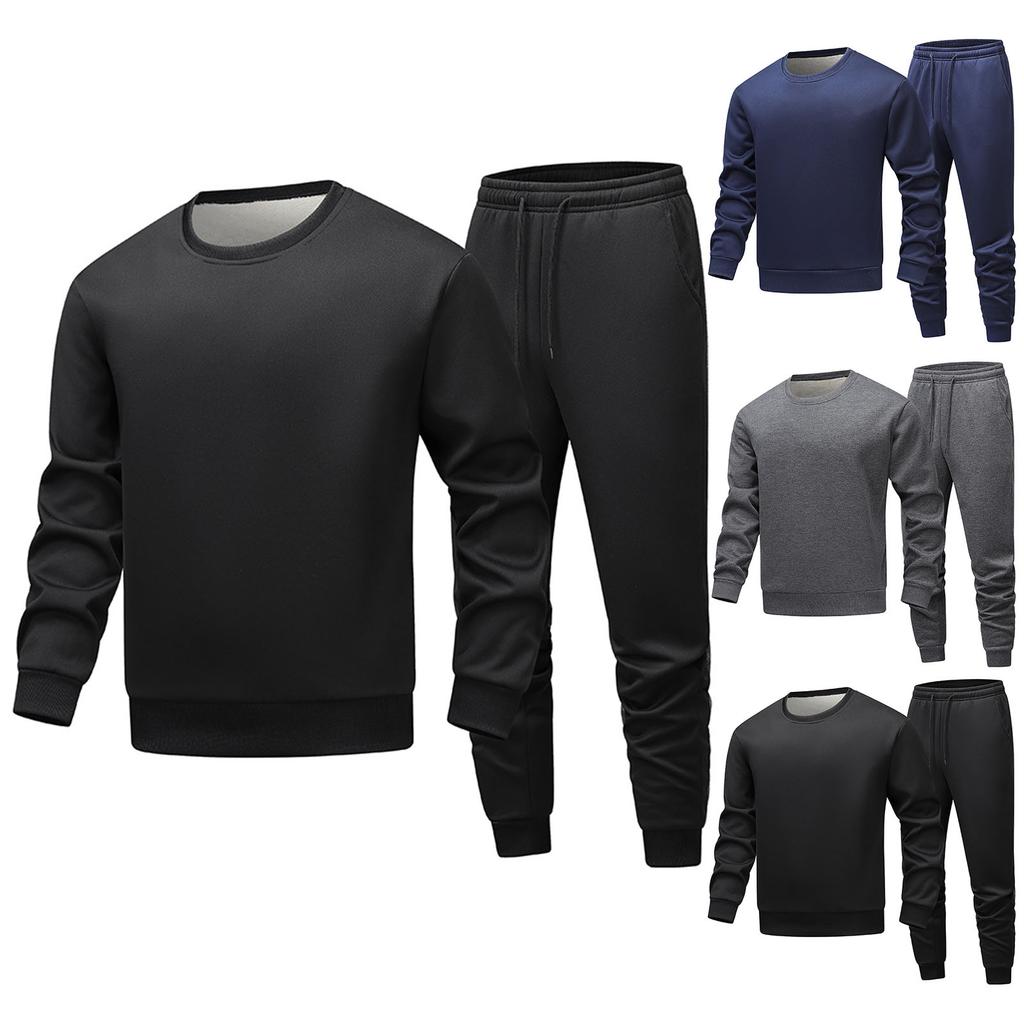 Herr Enfärgad Rund Hals Lammull Kostym Casual Sport Plus Sammet Förtjockad Långärmad Kostym