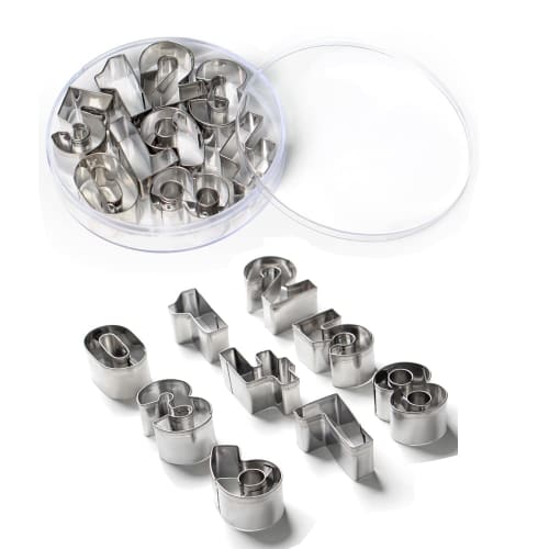 br> *Material: Made of food stainless steel.*Versatile: -Make cupcakes, cookies and expand your imagination!A standard for making sweets.Great for birthdays, Christmas, classroom use, Valentine's Day, and other events.- Contains numbers from 0 to 8 (number 9 is 6 upside down).Easy to clean with warm soapy water for excellent cutting control and easy cleaning.Made of 430 stainless steel, creates crisp letter and number cutouts *Safe to use for children: Designed with rolled top edges to protect fingers during the cutting process.Fun for crafts, you can use these cutters for your kids' play dough too!*Weight: 182g *Precautions: *Wash before use.* Dry when you store it.