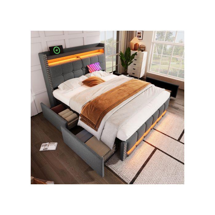 Lit rembourré - MUVOE - 140x200 cm - Éclairage LED - Prise USB - 4 tiroirs de rangement