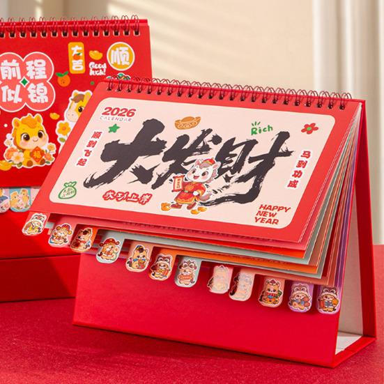 Omfamna Zodiak-temat för Hästens år med traditionella element som lejonföreställningar och bedårande hästillustrationer. Färgschemat i rött och guld utstrålar en festlig nyårsstämning, perfekt för att förhöja ditt utrymme med kulturell betydelse.. Fördjupa dig i de intrikata detaljerna i denna kalender, från den unika hästformade datummarkören till de inspirerande fraserna som "rikedom kommer från alla håll", varje element visar kreativitet och genomtänkt design.