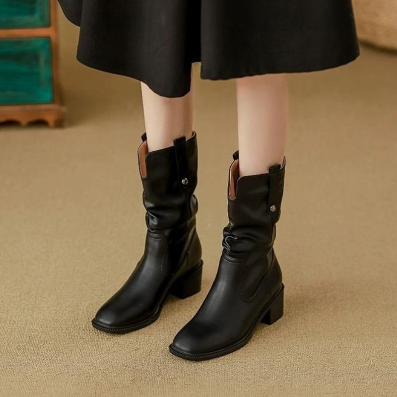 Round Toe Leather Ladies Mid Calf Shoes Fleece-Lined Middle Heel Women's Half High Boots New in Fashion 2025 Waterproof Y2k Boot