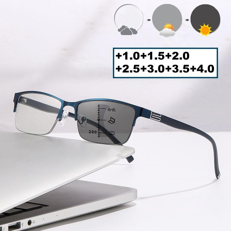 Unisex Pochromic Multifocal Reading Glasses Retro Half Frame Color Changing Presbyopia Men Women Fashion Far Sight Sunglasses