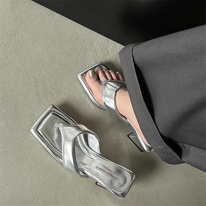 Mode Nya Sommartofflor Flip-flops Tofflor för Kvinnor Mode Fyrkantig Tå Grova Klackar Damskor Strandtofflor Sandaler Silverfärgade
