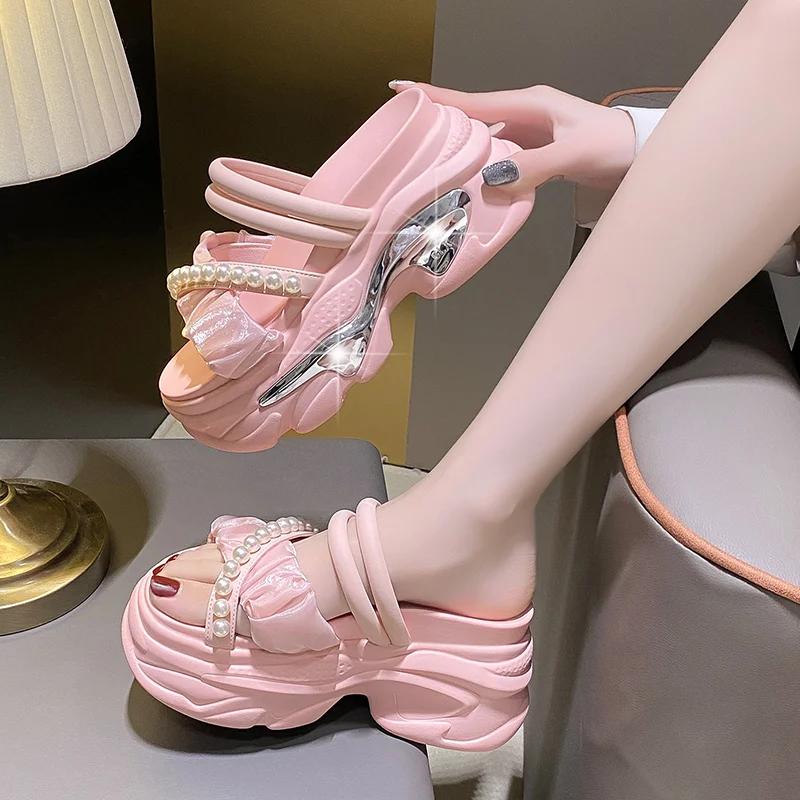 Mode Mode Pärlplatåsandaler Kvinnor Halkfria Kiltofflor Kvinna Sommar Tjock Sula Sandalias Mujer Hög Kvalitet