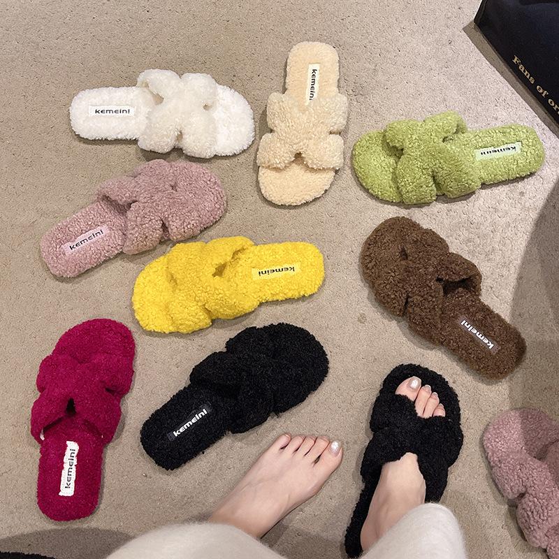 Flatsulade fluffiga tofflor för damers ytterkläder 2025 nya höst- och vinter tjocksulade inomhus hem mjukbottnade fluffiga bomullstofflor