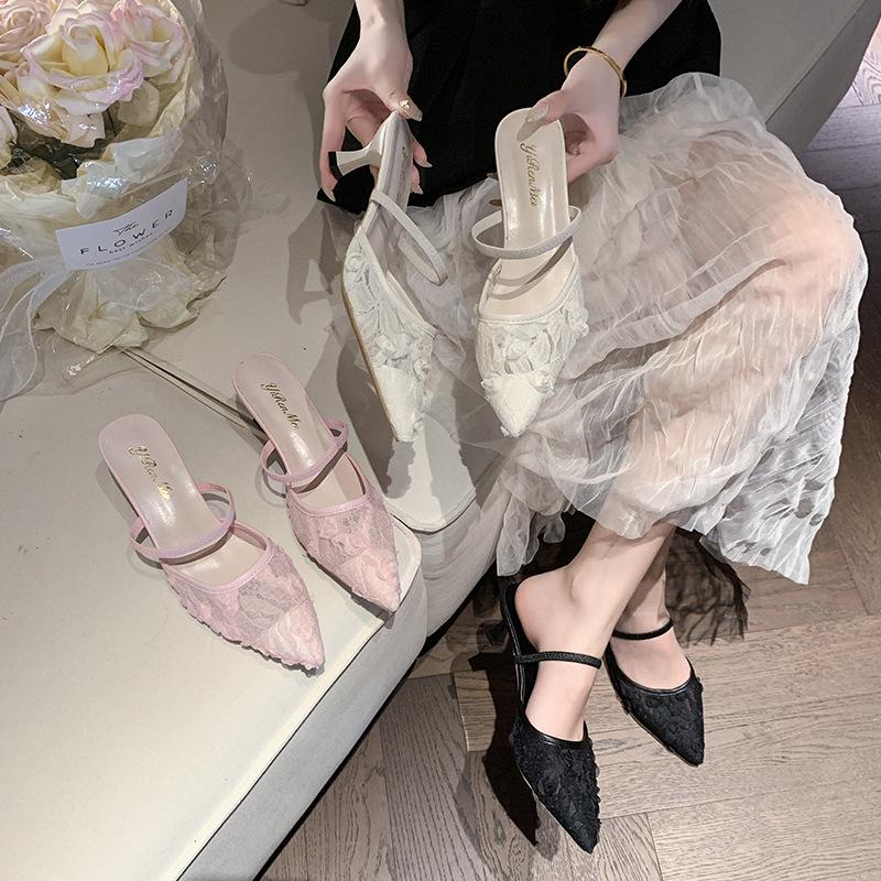 Mångsidiga svala tofflor 2025 sommar nya spets andningsbara spetsiga påshuvud halvtofflor damkläder högklackade svala tofflor