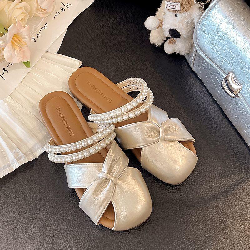 Beaded soft bottom flat bottom bag head half slippers women's summer wear 2025 new beautiful with skirt one word cool slippers