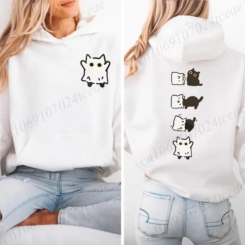 Autumn Fleece Hoodie Boo Black Cat Printed Hooded Halloween Fashion Sweatshirts Long Sleeve Top Drawstring Pockets Loose Hoodies