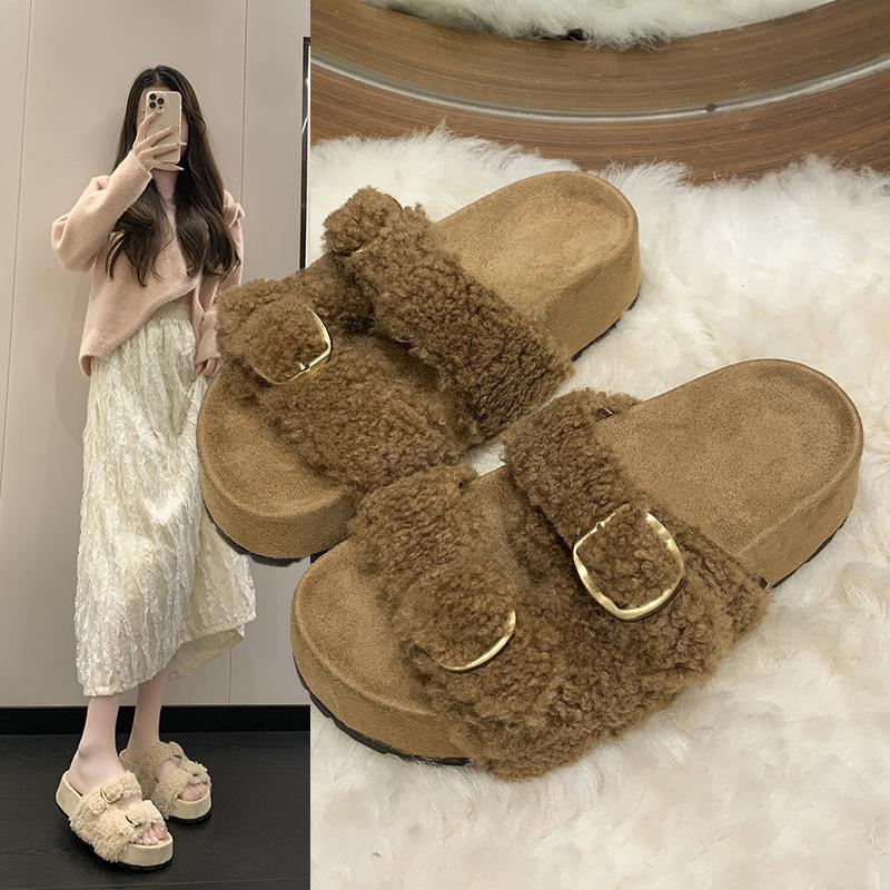 Muffin thick bottom one word fluffy slippers women wear 2025 autumn and winter new Internet celebrity fairy wind heightened plush half drag