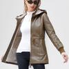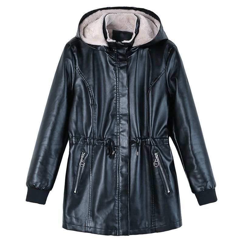 Autumn Winter Women's Fleece Leather Jacket Mid-Length Slim Fit PU Hooded Leather Jacket Flocked Thick Warm Leather Coat