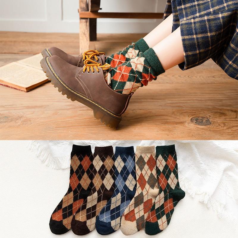 10 par/parti Damstrumpor med ränder Hög kvalitet Rutmönster Diamantmönster Harajuku Kammad Mellanhöga Färgstarka Bomullsstrumpor