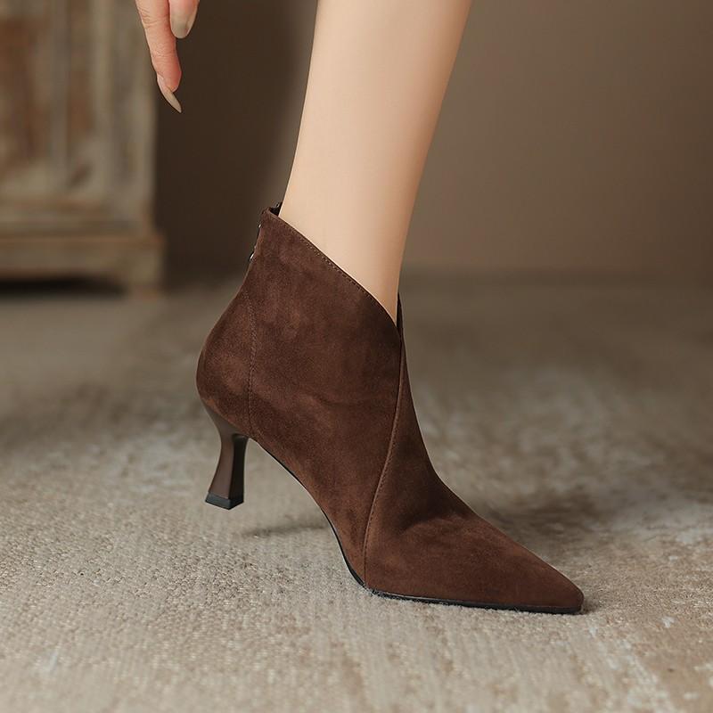 Lyxiga damstövlar vår spetsig tå stilett ankelstövlar mode svart brun dam högklack mocka sidodragkedja stövlar