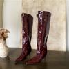 European and American style hot girls wear thin legs patent leather high boots, pointed toes are absolutely unique, high heels and thin heels, but kne