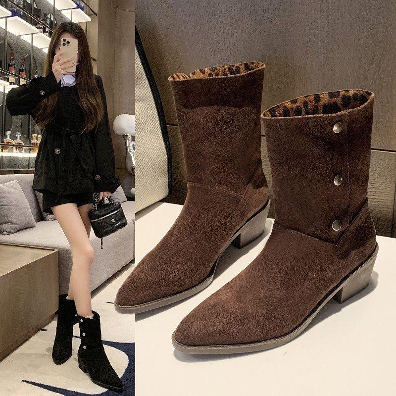 Stövlar mellanhöga stövlar brittisk stil mångsidiga 2025 spetsig tå höst och vinter retro tunna stövlar hög klack enkelstövlar tjock klack nya